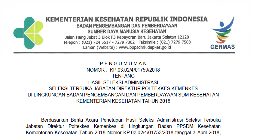 Seluruh calon yang dinyatakan lulus ditahap administrasi akan mengikuti pelaksanaan tahap ke-II yakni Asesmen bertempat di Makassar Kamis 12-4-2018 Pukul 08.00 WIB bersama calon direktur dari Poltekkes Manado dan Poltekkes Palu.