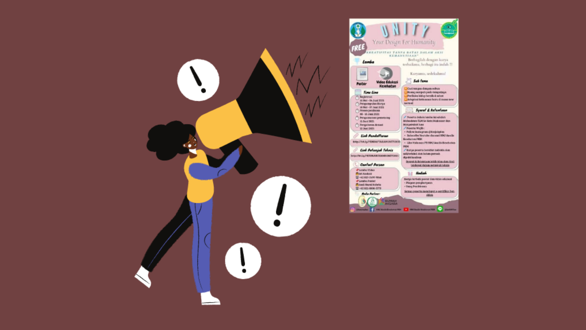 Perlombaan desain poster dan video edukasi kesehatan telah dibuka sejak 16 Mei lalu. Kegiatan UNITY tahun ini mengangkat tema Kreatifitas Tanpa Batas Dalam Aksi Kemanusiaan. Kegiatan ini diperuntukkan untuk seluruh Mahasiswa Jurusan Analis Kesehatan Se-Kota Makassar.