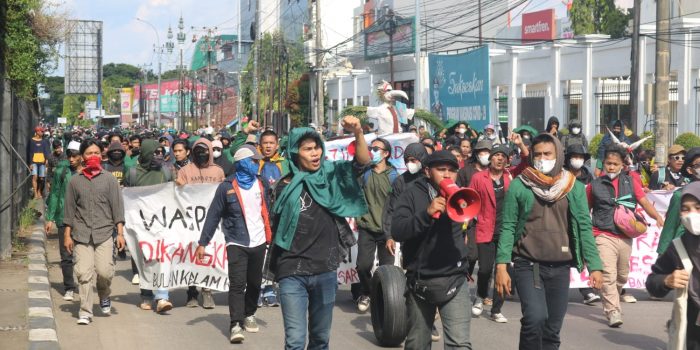 Aparat berseragam lengkap bersiaga dan memantau jalannya aksiMassa aksi menuju titik aksiPenyampain orasi oleh oratorPembakaran ban untuk mengobarkan semangat perlawananMassa aksi Aliansi Mahasiswa Makassar (AMM) beristirahat saat menuju titik aksiMassa aksi berunjuk rasa didepan kantor DPRD Provinsi Sulawesi Selatan