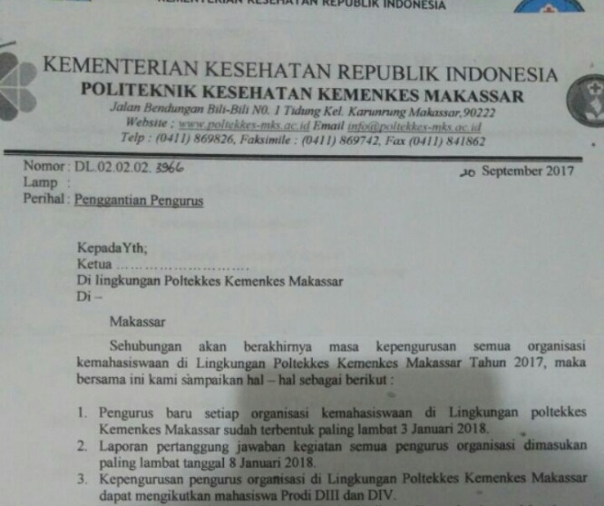 MAKASSAR, INTELLIGENT – Pelantikan Lembaga Kemahasiswaan (LK) tingkat Direktorat Politeknik Kesehatan Makassar (PKM) belum menuai titik terang hingga hari ini, Sebanyak 10 Lembaga yakni 8 Unit Kegiatan Mahasiswa (UKM), Badan Eksekutif Mahasiswa (BEM) dan Badan Perwakilan Mahasiswa (BPM) menunggu pelantikan oleh pihak Direktorat.