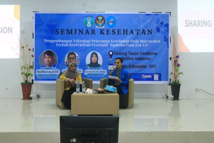 MAKASSAR,INTELIGENT – Menyambut era digital society 5.0 dengan konsep masyarakat yang berpusat pada manusia dan berbasis teknologi, Badan Eksekutif Mahasiswa (BEM) PKM beserta Unit Kegiatan Mahasiswa (UKM) Gerakan Anti Narkoba (GANK) PKM menggelar Seminar Kesehatan yang dilaksanakan di Aula Gedung B, Direktorat Poltekkes Kemenkes Makassar.